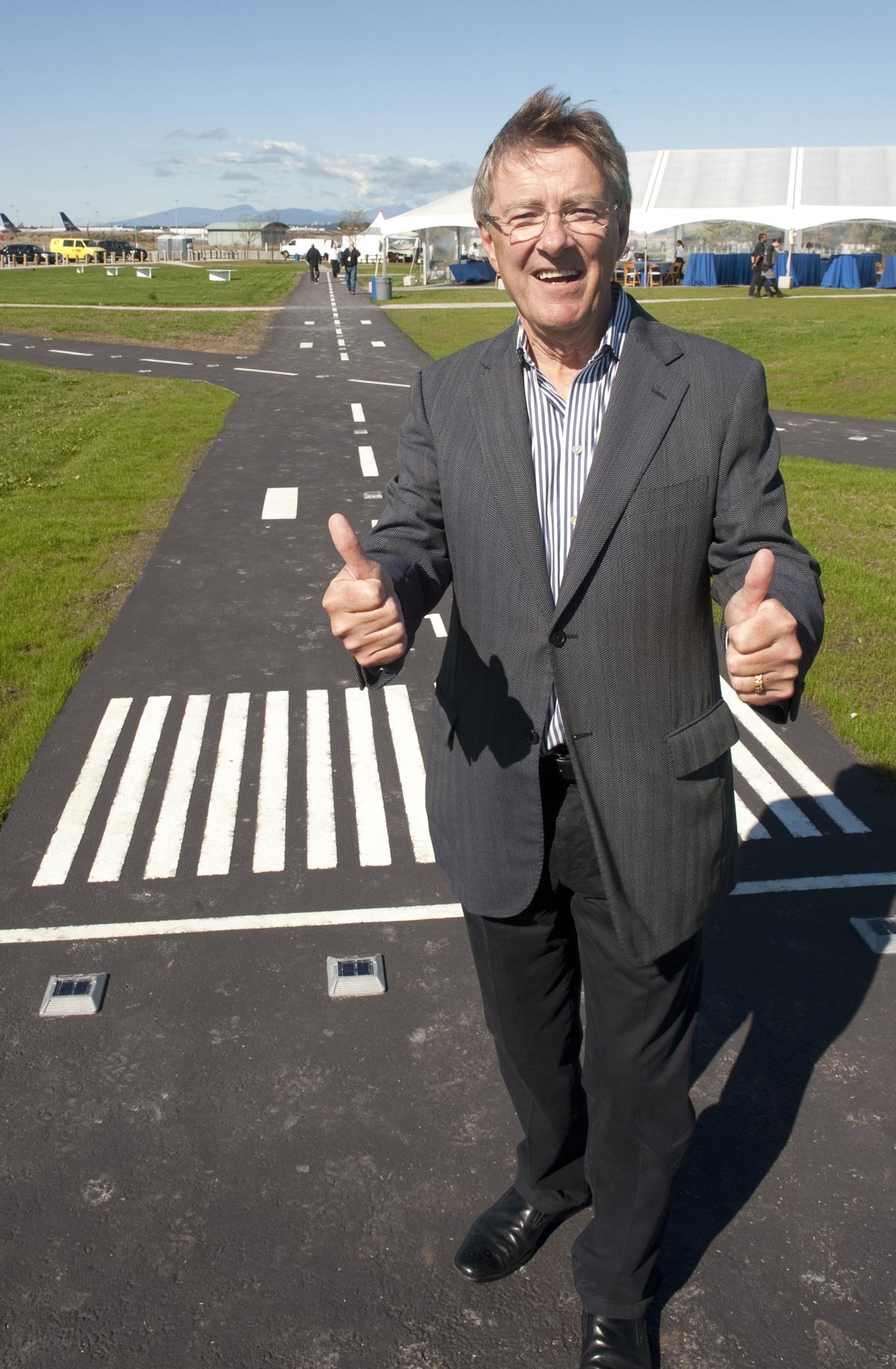 Larry Berg, former president and CEO Vancouver Airport Authority, gives the thumbs-up at the September 27, 2013 opening of the new and improved Larry Berg Flight Path.