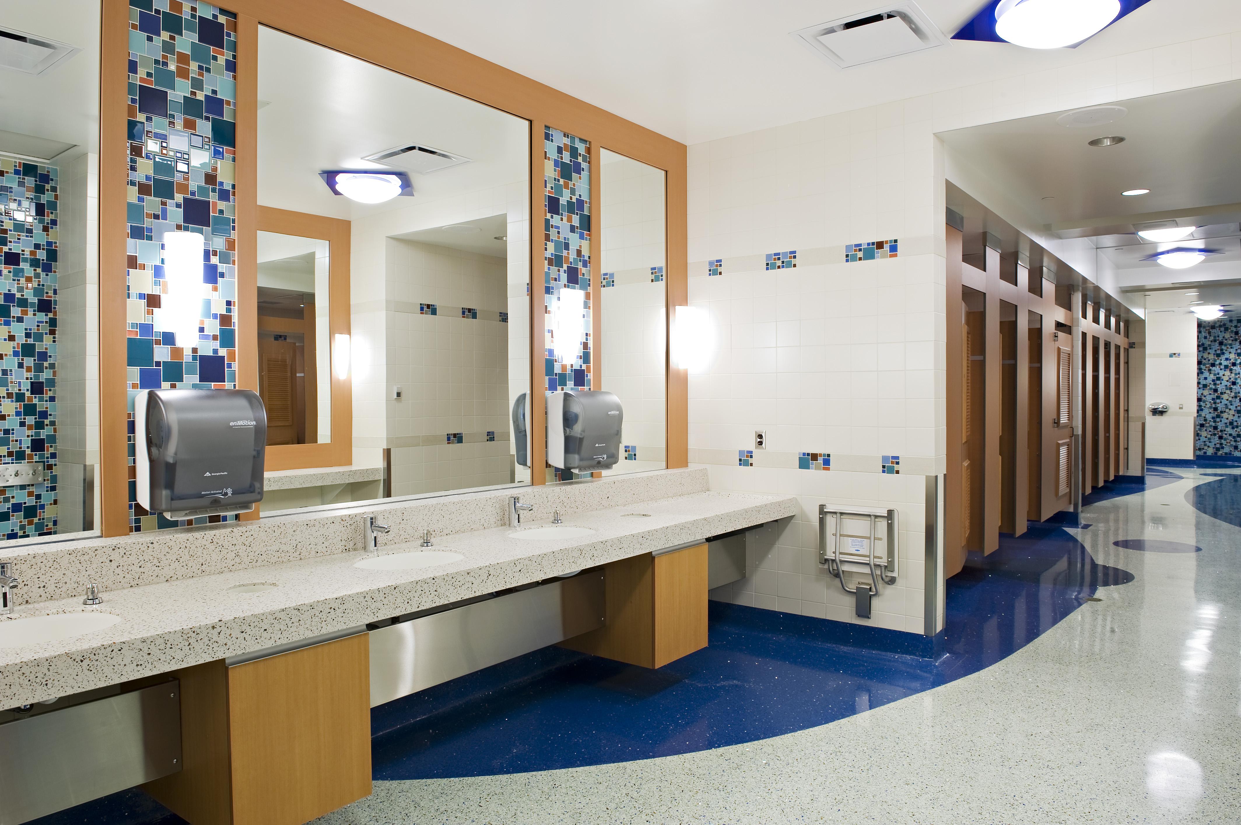 At YVR, travellers find clean, modern washrooms in which to freshen up during their journeys. The washroom walls in C-Pier of the Domestic Terminal are covered in shades of blue, red, and yellow mosaic tiles. Wave-shaped blue flooring winds down the curved corridor, leading guests to their choice of bathroom stalls.
