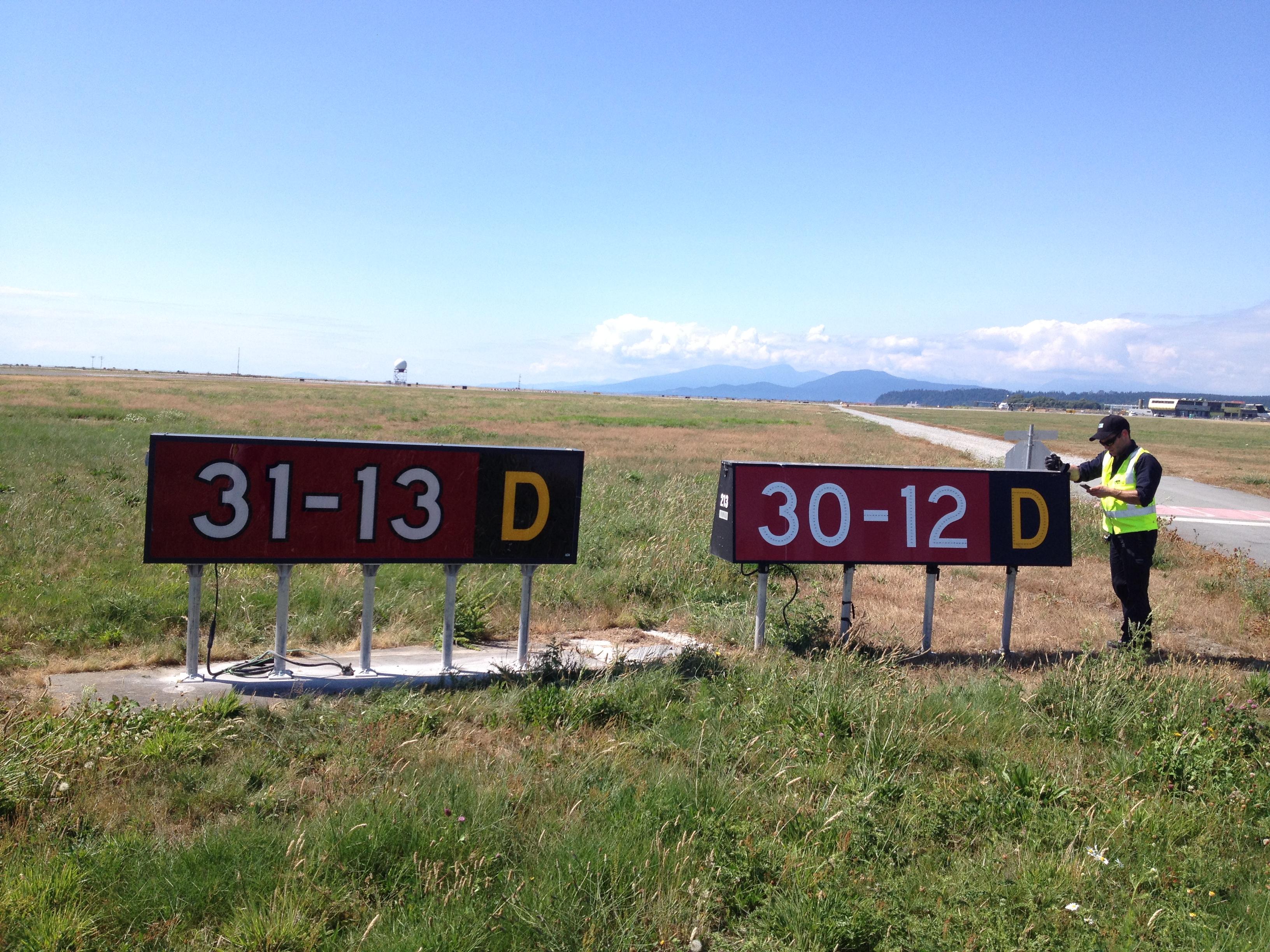A Vancouver Airport Authority employee replacing the 12-30 crosswind runway sign with a new 13-31 sign to reflect the realigment of the runway with the shifting magnetic heading.