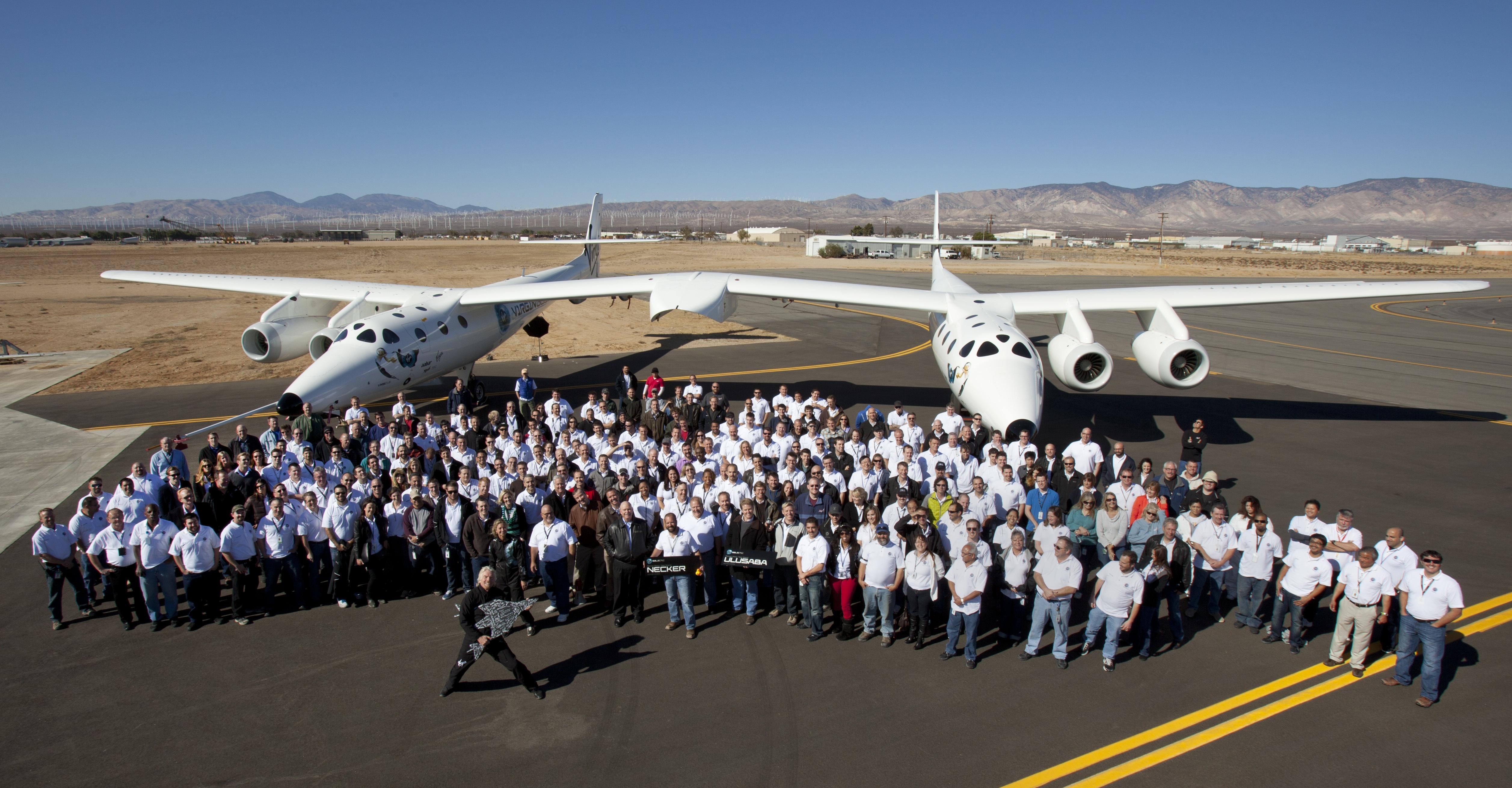 Sir Richard Branson with the team of rocket scientists who were involved in building Virgin Galactic’s SpaceShip Two and WhiteKnightTwo spacecraft.