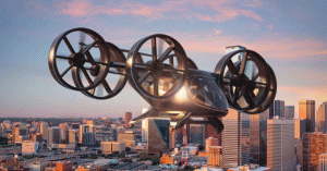 The air taxi, named Bell Nexus, is powered by a hybrid-electric propulsion system and features Bell’s signature-powered-lift concept incorporating six tilting ducted fans.